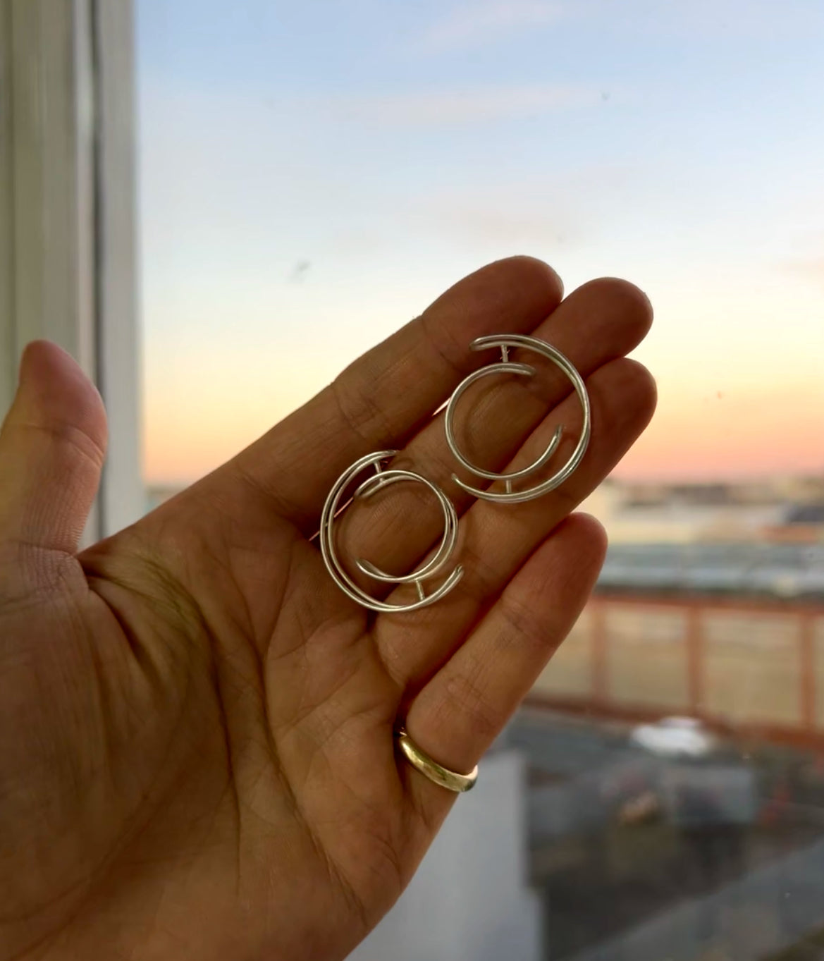 Inspired by the artificial light ‘glow’ caused by streetlights. Sterling silver wire is manipulated to create structural two-part earrings.