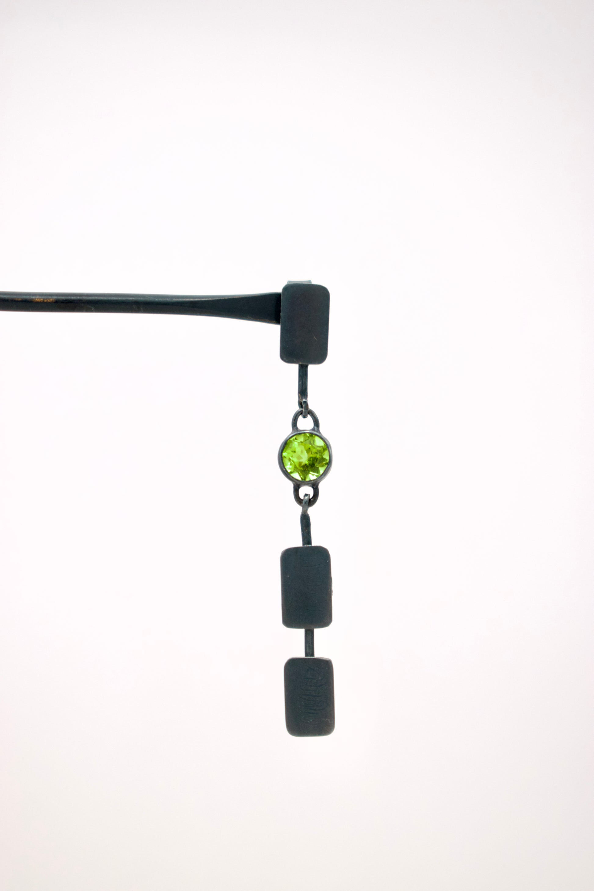 Asymmetric earrings with peridot gemstones. Recycled sterling silver wire and sheet with an oxidised black finish. Set sparkling peridots set asymmetrically.